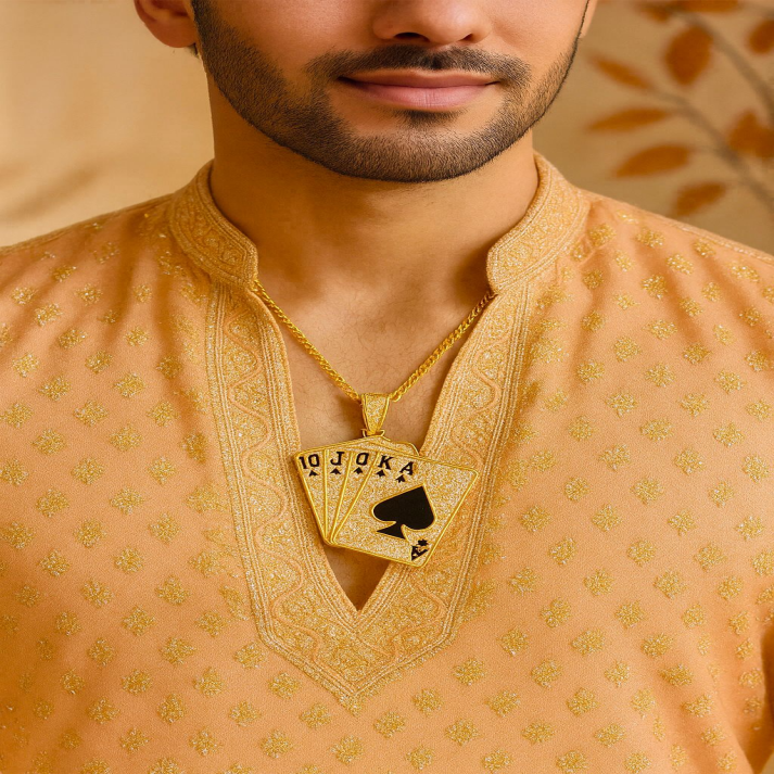 Stand out with this bold Poker Cards Pendant, featuring a royal flush design (10, J, Q, K, A of Spades) in gold with dazzling diamonds. A statement piece for men who love luxury and winning style. Perfect for parties, gifting & everyday glam.