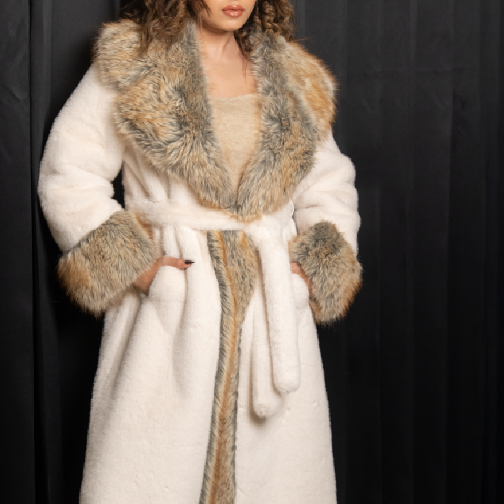 Embrace the drama of winter with 'The Arctic Opulence' Coat from the Label Luxe Mulher Collection. This breathtaking piece features a plush cream/ivory body beautifully contrasted with rich, multi-toned faux fur trim on the collar, cuffs, and front placket. The included self-tie belt cinches the waist, creating a flattering, luxurious silhouette. This coat is the pinnacle of glamour, designed for the woman who demands a head-turning statement in her winter wardrobe.